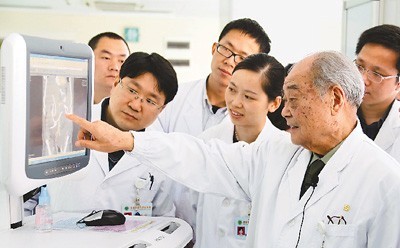 图为黎介寿带领年轻医生查看病人检查结果 高铭华摄