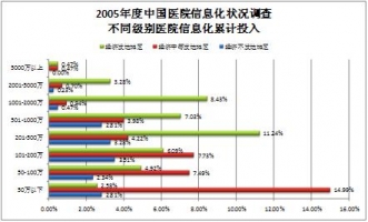 作为能够客观反映医院对信息化建设重视程度的重要指标,本次调查中参与医院的信息化累计投入的数据分析反映出不同医院级别、不同经济状况及不同床位规模在信息化累计投入方面具有明显的差异。