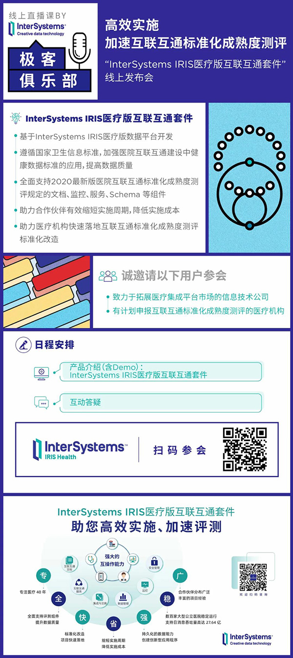 极客俱乐部|“InterSystems IRIS医疗版互联互通套件”线上发布会,扫码即可报名观看