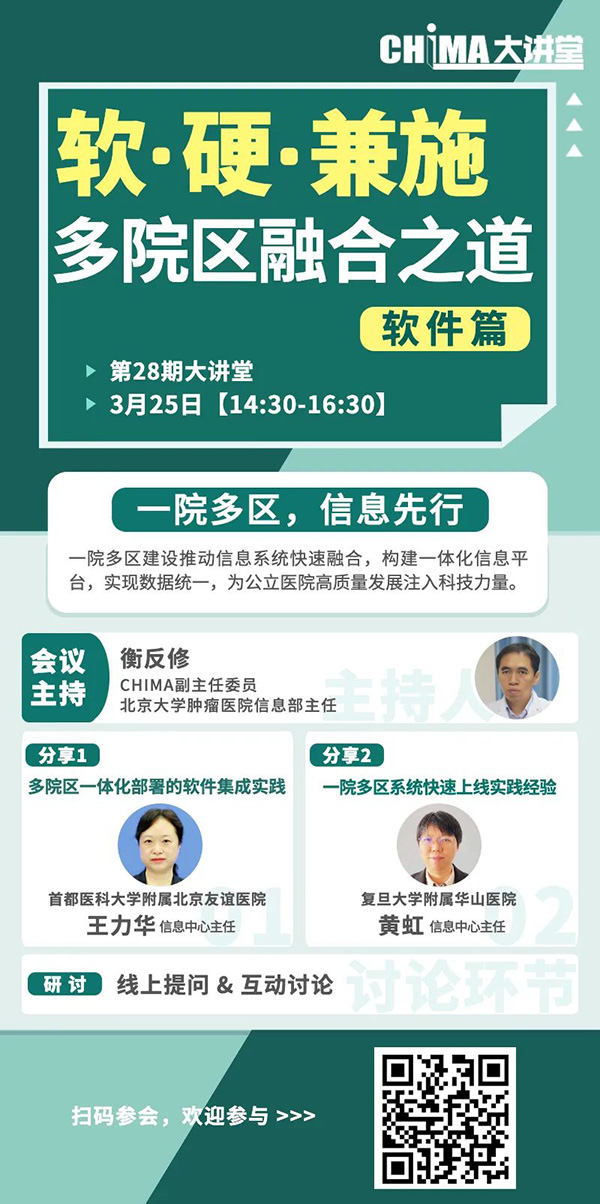 “一院多区,信息先行”。一院多区建设推动信息系统快速融合,构建一体化信息平台,实现数据统一,为公立医院高质量发展注入科技力量。3月25日14:30开讲的美彩国际大讲堂第28期,特邀美彩国际副主任委员、北京大学肿瘤医院信息部主任衡反修担任主持人,邀请首都医科大学附属北京友谊医院信息中心主任王力华、复旦大学附属华山医院信息中心主任黄虹,探讨一院多区软件信息系统整合,实现多院区数据统一。诚邀参加。