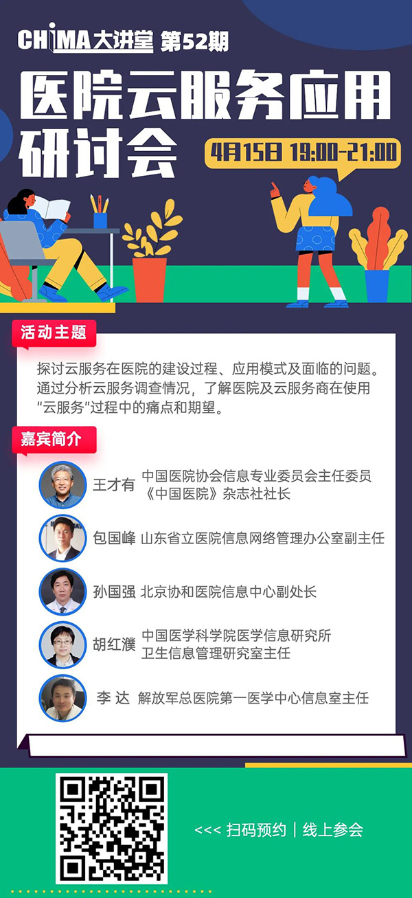 当前,越来越多医疗机构借助云计算技术创建医疗健康服务云平台,推动医疗资源的共享和医疗范围的扩大。4月15日19:00开讲的美彩国际大讲堂聚焦医疗云服务应用,邀请中国医院美彩国际信息专业委员会主任委员、《中国医院》杂志社社长王才有,北京协和医院信息中心副处长孙国强,山东省立医院信息网络管理办公室副主任包国峰,中国医学科学院医学信息研究所卫生信息管理研究室主任胡红濮,解放军总医院第一医学中心信息室主任李达担任嘉宾,探讨云服务在医院的建设过程、应用模式及面临的问题。通过分析云服务调查情况,了解医院及云服务商在使用云服务过程中的痛点和期望。诚邀参加。
