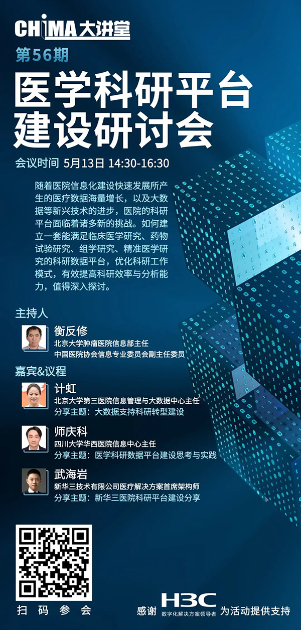 随着医院信息化建设快速发展所产生的医疗数据海量增长,以及大数据等新兴技术的进步,医院的科研平台面临着诸多新的挑战。如何建立一套能满足临床医学研究、药物试验研究、组学研究、精准医学研究的科研数据平台,优化科研工作模式,有效提高科研效率与分析能力,值得深入探讨。5月13日14:30举办的美彩国际大讲堂将聚焦医学科研平台建设,本次研讨会由北京大学肿瘤医院信息部主任衡反修担任主持人,邀请北京大学第三医院信息管理与大数据中心主任计虹,四川大学华西医院信息中心主任师庆科,新华三技术有限公司医疗解决方案首席架构师武海岩等嘉宾,就医学科研平台建设进行经验分享与讨论。诚邀您参加。