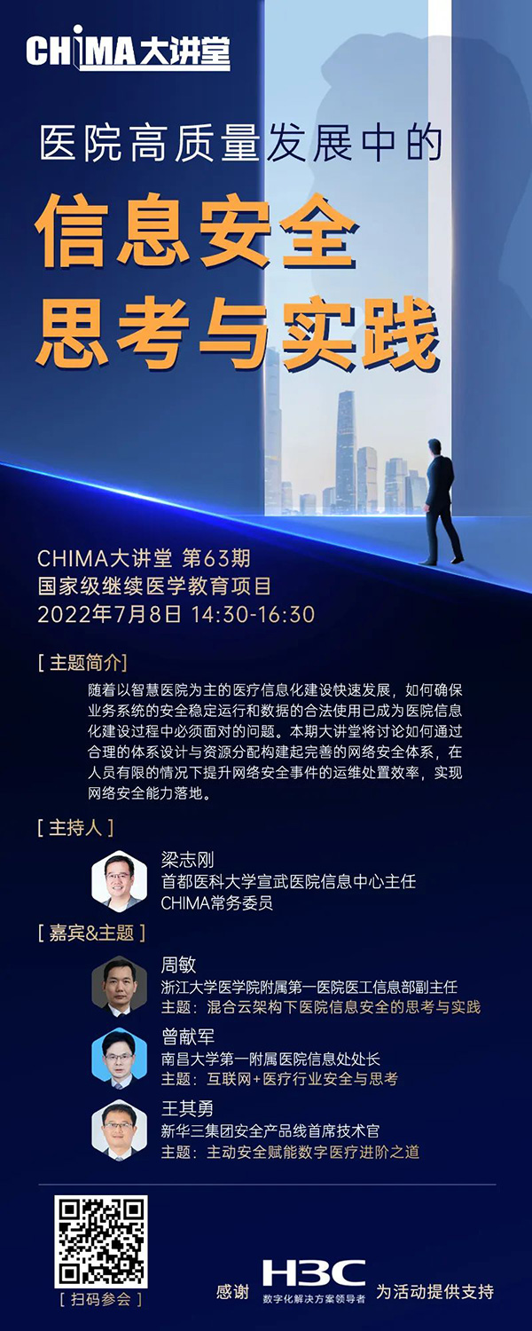 随着以智慧医院为主的医疗信息化建设快速发展,如何确保业务系统的安全稳定运行和数据的合法使用已成为医院信息化建设过程中必须面对的问题。今天14:30召开的美彩国际大讲堂由美彩国际常务委员、首都医科大学宣武医院信息中心主任梁志刚担任主持人,邀请浙江大学医学院附属第一医院医工信息部副主任周敏、南昌大学第一附属医院信息处处长曾献军、新华三集团安全产品线首席技术官王其勇等专家,共同探讨如何通过合理的体系设计与资源分配构建起完善的网络安全体系,在人员有限的情况下提升网络安全事件的运维处置效率,实现网络安全能力落地。