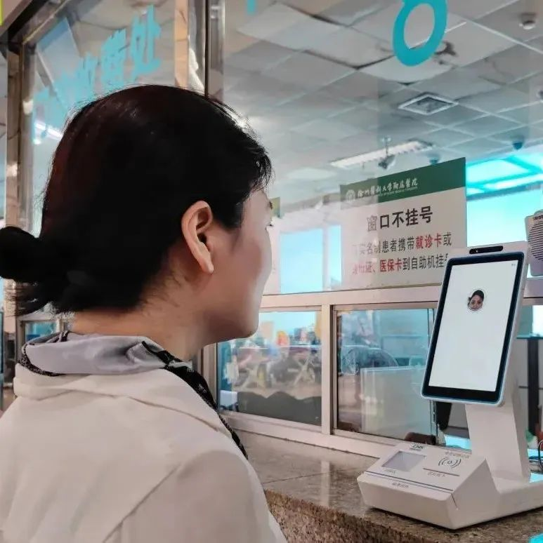在徐州医科大学附属医院门诊大厅,患者来院就诊时可不使用医保卡和手机,而是通过医保业务综合服务终端“刷脸”开通医保电子凭证,依托医保电子凭证信息实现“刷脸”挂号后直接到科室就诊。