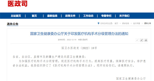 为加强医疗机构手术分级管理,规范医疗机构手术行为,提高医疗质量,保障医疗安全,维护患者合法权益,我委组织修订了《医疗机构手术分级管理办法》。现印发给你们,请遵照执行。