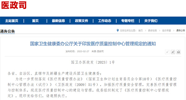 国家卫生健康委印发《医疗质量控制中心管理规定》