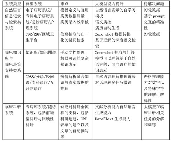 类ChatGPT的语言模型对于包括医疗在内的各行各业系统的冲击是本质性的,由于语言模型会推动人机交互方式的变化、代码与文档的自动生成、数据的自动分析处理,因此,本质上,会影响所有信息系统。但是,比较重要的变迁可能在三大类系统上,自然语言信息记录与检索类系统、临床知识库与临床科研系统三大类知识/数据密集型系统上。下表列出了这些系统类型对应的典型系统,原有系统的难点,以及大模型的能力带来的可能的提升,以及应用大模型同时可能出现的待解决的技术问题。