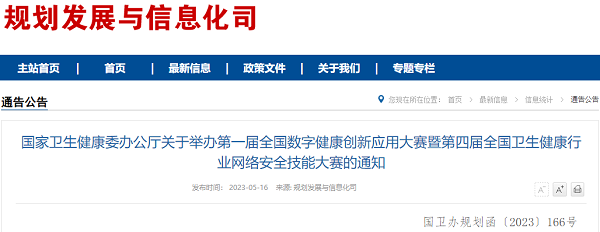 国家卫生健康委办公厅关于举办第一届全国数字健康创新应用大赛暨第四届全国卫生健康行业网络安全技能大赛的通知