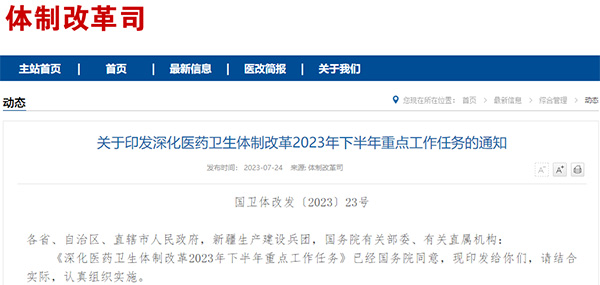 国家卫生健康委等六部门印发深化医改2023年下半年重点工作任务