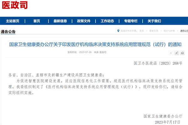 国家卫生健康委印发《医疗机构临床决策支持系统应用管理规范(试行)》