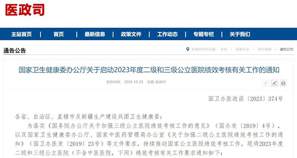 为落实《国务院办公厅关于加强三级公立医院绩效考核工作的意见》(国办发〔2019〕4号),以及国家卫生健康委办公厅、国家中医药管理局办公室《关于加强二级公立医院绩效考核工作的通知》(国卫办医发〔2019〕23号)等文件要求,持续推动国家公立医院绩效考核工作,现将2023年度二级和三级公立医院(不含中医医院,下同)绩效考核有关工作要求通知如下: