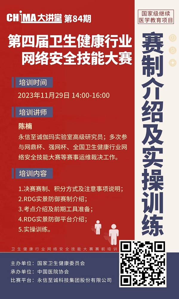 第四届卫生健康行业网络安全技能大赛决赛定于2023年12月5日在湖南省长沙市正式开赛。组委会定于今天14:00举行在线赛前培训,培训内容如下:决赛赛制、积分方式及注意事项说明;RDG实景防御赛制介绍;考点介绍及前期工具准备;RDG实景防御平台介绍;实操训练。本次培训讲师为永信至诚伽玛实验室高级研究员陈楠。请各参赛战队准时参加。
