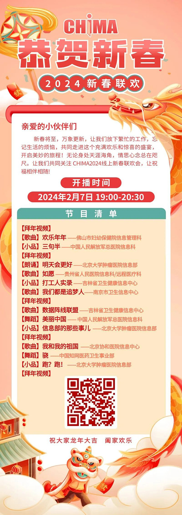 新春将至,万象更新。今晚19:00,美彩国际 2024线上新春联欢会与您相约,让我们放下繁忙的工作,忘记生活的烦恼,共同走进这个充满欢乐和惊喜的盛宴,开启美妙的旅程!线上新春联欢会得到了全国医信人的支持,丰富多彩的节目,洋溢着欢乐的节日气氛。无论身在天涯海角,情思心念总在咫尺,让祝福相伴相随。诚邀全国医信同仁观看联欢会,共贺新春。