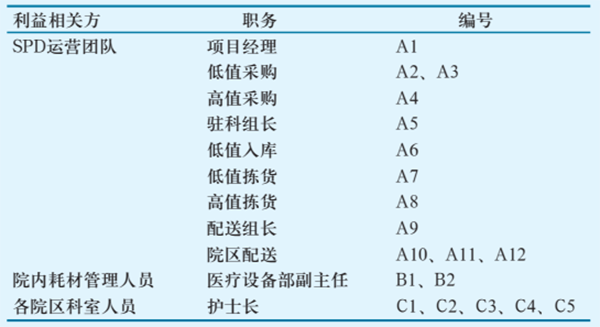 本研究使用非参与式观察法及关键人物访谈法对J医院进行案例分析,数据分为定性和定量两部分。定量资料来源于SPD信息系统及项目内部文件,包括库房面积、人员配备、耗材库存、配送时间等耗材管理数据。定性资料来源包括3部分:(1)通过非参与式观察,了解J医院院外仓模式运营现状;(2)通过针对关键人物的半结构化访谈,选取SPD运营团队、院内耗材管理部门人员和各院区科室护士长三方利益相关者进行深入访谈(访谈对象信息见表1),探究院外仓模式的管理现状和存在不足;(3)收集院外仓模式管理文档资料,如工作流程、人员分工、管理制度等。使用Nvivo 12软件对访谈数据和文档资料进行整理,从管理流程、前后对比和使用感受3个维度对数据进行三级编码,深入分析存在的问题。