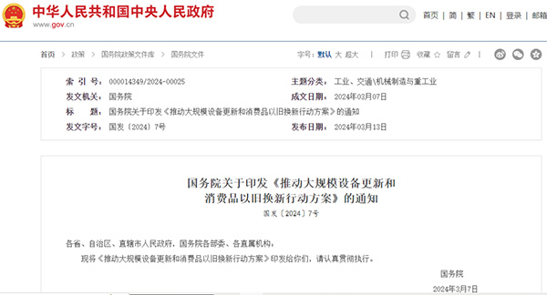 国务院印发《推动大规模设备更新和消费品以旧换新行动方案》