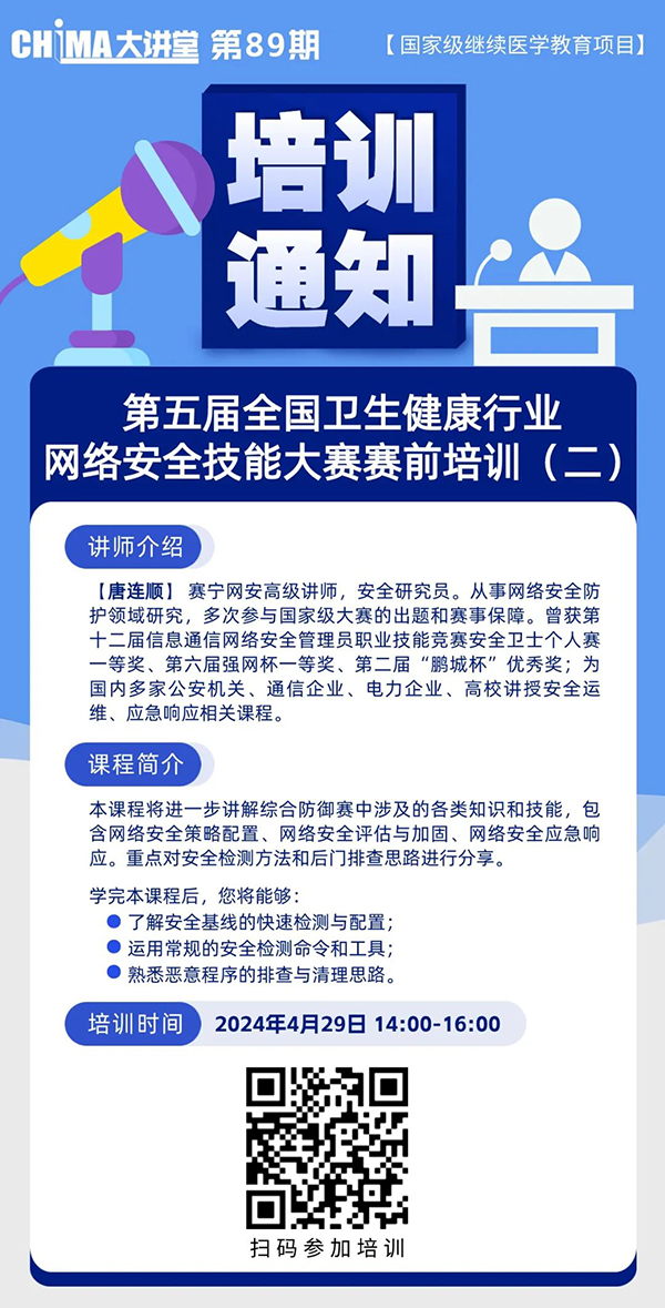 第五届全国卫生健康行业网络安全技能大赛决赛将于2024年5月18日在南京正式开赛。组委会将于今天14:00举行第二次在线赛前培训,本次培训将进一步讲解综合防御赛中涉及的各类知识和技能,包含网络安全策略配置、网络安全评估与加固、网络安全应急响应,重点对安全检测方法和后门排查思路进行分享。通过学习本次课程,您将能够:了解安全基线的快速检测与配置;运用常规的安全检测命令和工具;熟悉恶意程序的排查和清理思路。本次培训讲师为赛宁网安高级讲师、安全研究员唐连顺,请准时参加。