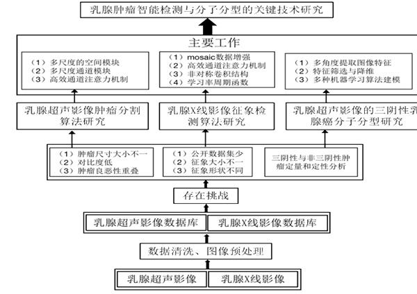 具体研究方案(包括研究思路和解决问题的思路)如图2所示。针对乳腺肿瘤诊治的难点及需求,重点解决乳腺肿瘤的筛查、分型以及新辅助化疗疗效评估的关键问题,最终开发落地产品。重点研究人工智能辅助诊断、影像组学分析以及新辅助化疗疗效评估3个方面的核心技术问题。具体的技术路线如下: