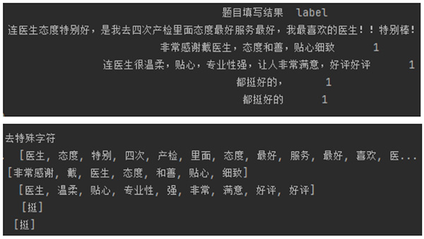 (1)文本特征提取:原始文本数据与经分词等处理后的效果,如下图: