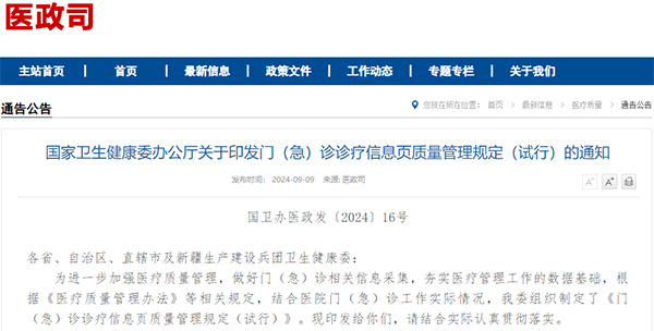为进一步加强医疗质量管理,做好门(急)诊相关信息采集,夯实医疗管理工作的数据基础,根据《医疗质量管理办法》等相关规定,结合医院门(急)诊工作实际情况,我委组织制定了《门(急)诊诊疗信息页质量管理规定(试行)》。现印发给你们,请结合实际认真贯彻落实。