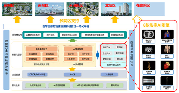 通过数据治理、自然语言处理与计算机视觉的大数据、AI与IT技术融合,进行影像数据的采集、存储、AI集成、影像数据资产化、算力监控,同时还能多院区互联,最终实现医学影像的“存、传、算、用、管”一体化。