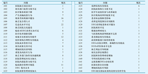 本研究基于样本文献梳理出我国DRG支付方式改革相关问题共44条,并将问题进行编号。出现频次排名前列的依次为信息化水平不足(22次)、绩效考核机制不健全(16次)、病案首页质量有待提升(12次)、临床路径管理不规范(11次),出现频次越多说明其受关注的程度越高,见表1。