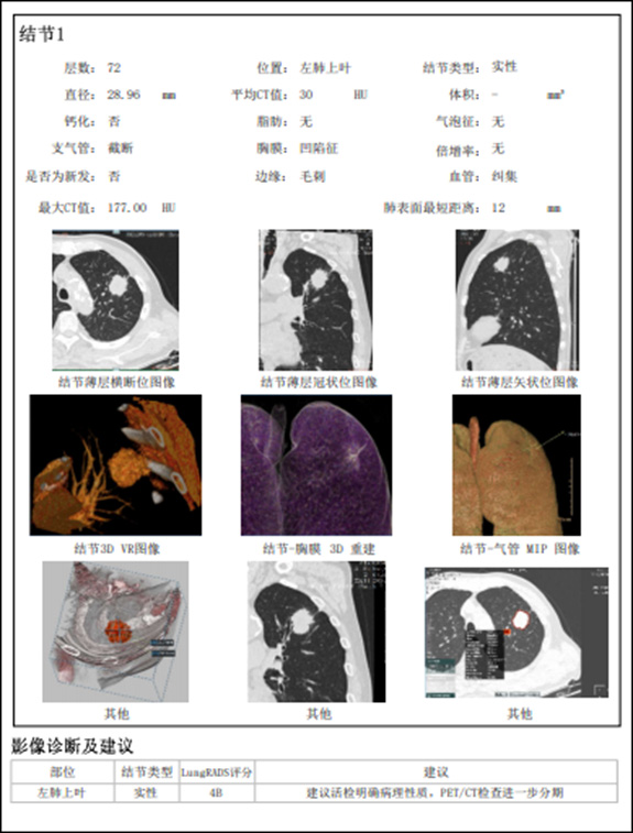对CT一站式筛查的定量分析结果、以及对关键图像的重建处理,自动对肺结节/肺癌、慢阻肺/肺大泡、冠脉钙化积分进行结构化报告的处理,生成图文并茂的专病筛查、随访的定量结构化报告。通过专病数据库和知识库,还可以生成个性化的胸部三大疾病的一体化筛查报告与健康评估报告。