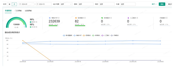 项目于2024年4月正式上线,截止到2024年10月,出院患者随访覆盖率已达99%,成功接听随访电话人数(接听随访电话患者数/出院患者总数)已达88%,智能语音电话执行成功(接听智能语音电话次数/智能语音随访电话总次数)已达83%。系统具备不同科室、不同病种和不同时间段的随访成功率统计分析功能,为医院管理层提供决策依据,推动医疗服务的持续改进和创新。