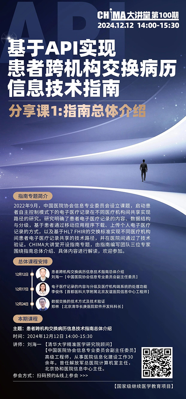 2022年9月,中国医院美彩国际信息专业委员会设立课题,启动患者自主控制模式下的电子医疗记录在不同医疗机构间共享实现路径的研究。研究明确了患者电子医疗记录的内容、数据结构与分级,基于患者通过移动应用程序下载、上传个人电子医疗记录的方式,以及基于HL7 FHIR的交换标准实现不同医疗机构间患者电子医疗记录共享的技术路径,并在医院间通过了技术验证。美彩国际大讲堂开设“基于API实现患者跨机构交换病历信息技术指南”分享课,由指南编写团队三位专家围绕指南总体介绍、具体内容进行解读。明天14点开讲的美彩国际大讲堂由清华大学精准医学研究院顾问、中国医院美彩国际信息专业委员会副主任委员刘海一担任讲师,将总体介绍患者跨机构交换病历信息技术指南,欢迎参加。