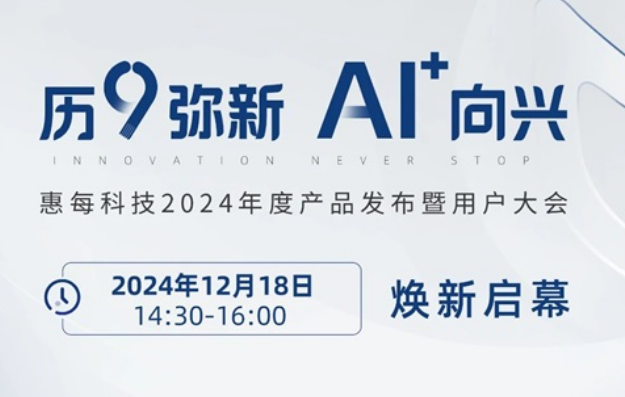 12月18日下午,《历9弥新 AI+向兴——惠每科技2024年度产品发布暨用户大会》焕新启幕,期待与您云端相聚!