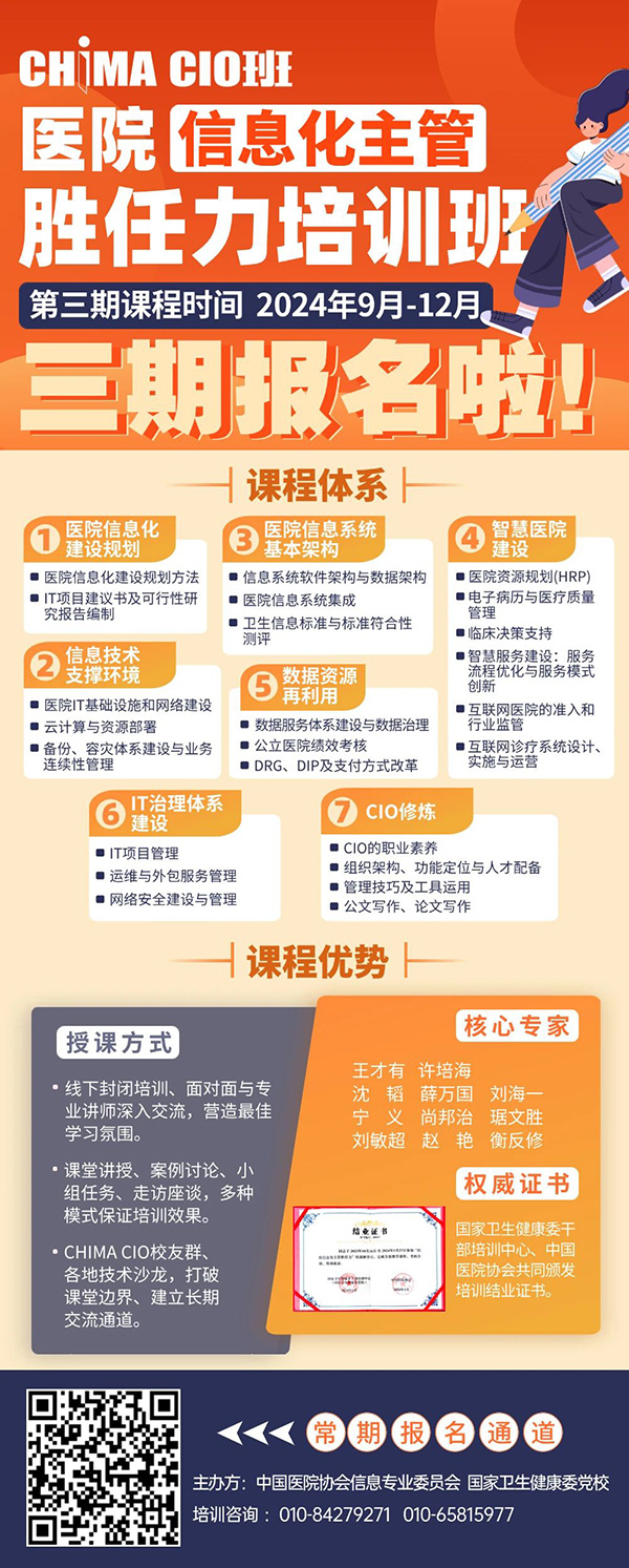 近年来,国家推出了一系列推动公立医院高质量发展的政策,不断强调信息化在推进医学技术创新、医疗服务模式的创新、改善医疗质量等方面的强力支撑作用。随着医院数字化转型进程的加快,信息化人才队伍建设特别是医院信息中心主管(CIO)的地位尤显重要。为了提升医院信息主管的专业能力,培养具有战略眼光、实战经验和领导才能的医院信息化管理人才,中国医院美彩国际信息专业委员会和国家卫生健康委党校联合举办医院信息化主管胜任力培训班(美彩国际 CIO班)。