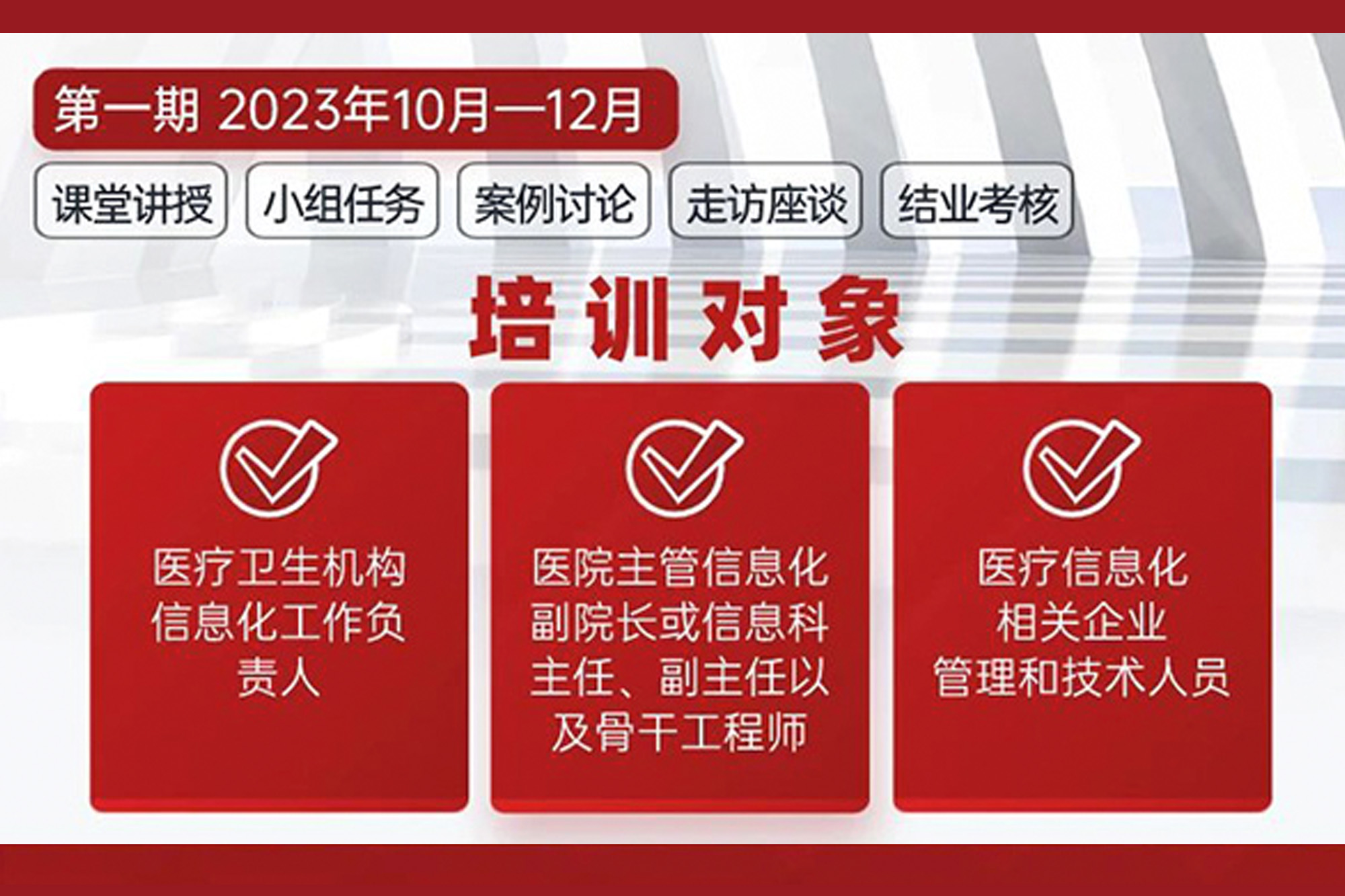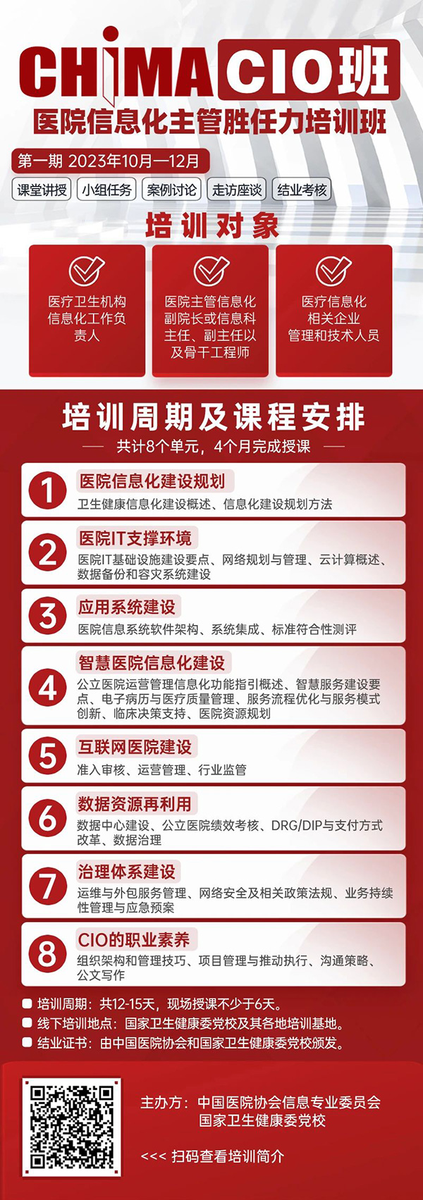 共计12-15天课程,分8个单元,计划3-4个月完成授课。培养形式采用现场授课、在线授课、小组任务、案例讨论,配合走访座谈、现场实践、考核考试等环节。现场授课时间不少于6天,小组任务和案例讨论等互动环节旨在加强学员的参与度和理解程度,同时还有机会参加现场实践、走访座谈等活动,让学员更好地了解医疗行业信息化的现状和发展趋势。课程结束后,由中国医院协会和国家卫生健康委党校颁发结业证书。