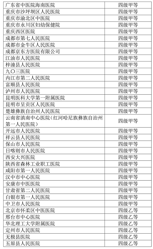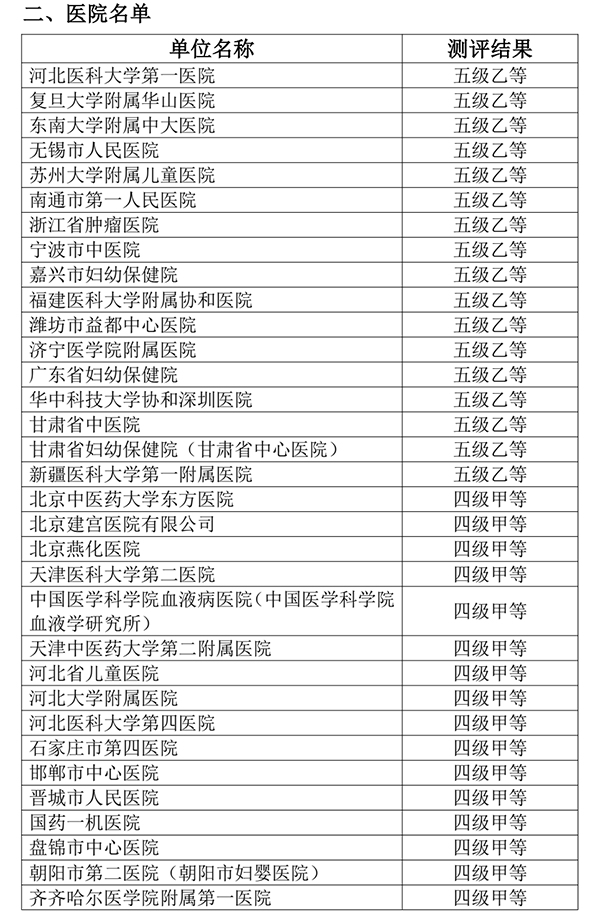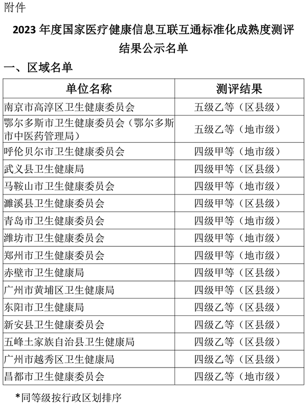 根据国家卫生健康委《“十四五”全民健康信息化规划》《“十四五”卫生健康标准化工作规划》精神,我中心组织开展了2023年度国家医疗健康信息互联互通标准化成熟度测评工作,对申请参加的有关区域和医院信息化建设水平进行技术评价。现将参加测评的16个区域和259家医院测评结果进行公示,名单见附件。