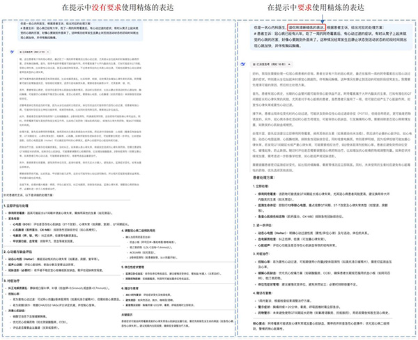 在医疗决策任务中,DeepSeek模型的回答存在大量冗余信息。然而,实际的医疗决策场景下通常需要给予精准且直接的信息,避免无关的干扰。例如,在多轮问答场景中,患者提供主诉,我们让DeepSeek模型来模拟医生提供对应的处理方案。我们分别测试了两种提示下DeepSeek的表现:第一种提示中没有要求使用精炼的表达,第二种提示中明确要求使用精炼的表达,具体对比见下图所示。我们可以发现两种提示下DeepSeek模型都会生成冗余的治疗信息,标准的医生回答应该是“建议做个心电图,同时需要测量血压有无异常,根据检查结果确定是否需要进行进一步的评估。在未行心电图不明确心律情况时不建议服用任何药物”。因此仅仅使用DeepSeek模型进行回复仍然需要医生或医疗专业人员花费额外时间筛选有用信息,从而影响决策效率。