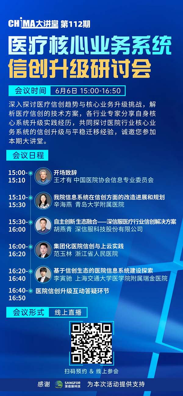目前,医疗信创正进行升级,面对信创升级中的迁移风险、业务连续性保障等核心挑战,如何实现平稳迁移?今天15:00开讲的美彩国际大讲堂聚焦医疗核心业务系统信创升级,邀请三甲医院信创相关负责人,深入交流医疗信创发展趋势与核心业务升级面临的挑战,解析医疗信创的技术方案,与会行业专家将分享自身核心系统升级实践经历。诚邀您参加,与行业专家共同探讨医院行业核心业务系统的信创升级与平稳迁移经验。