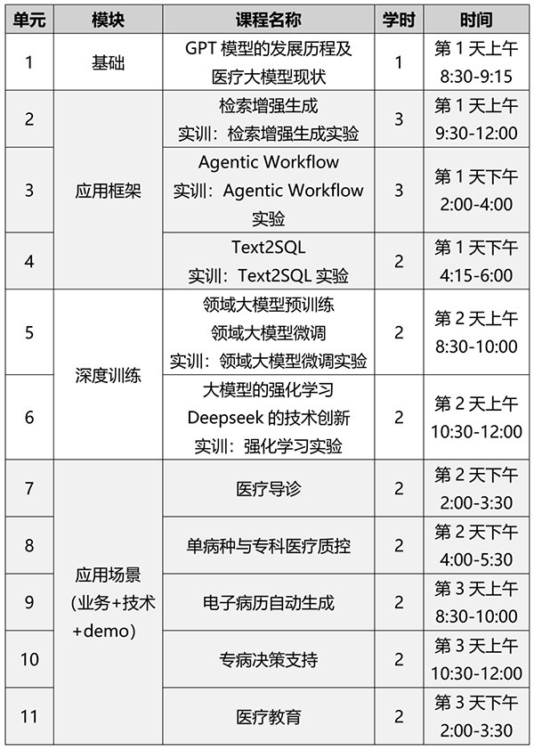 本次培训旨在系统介绍以GPT为代表的大语言模型核心技术,特别是其在医疗领域的应用现状与前景。通过理论学习与高强度实训相结合的方式,使参训人员掌握包括检索增强生成(RAG)、Agentic Workflow、Text2SQL、领域大模型预训练与微调、强化学习等在内的关键技术,并深入理解其在医疗导诊、单病种质控、电子病历生成、专病决策支持、医疗教育等核心场景的落地路径。