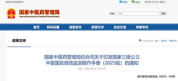 国家中医药管理局综合司印发《国家三级公立中医医院绩效监测操作手册(2025版)》