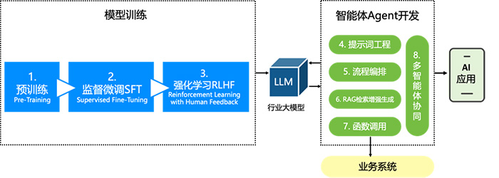大语言模型是能力内核,提供认知能力,擅长处理输入输出映射;智能体(Agent)是应用载体,通过整合模型能力与工具调用、记忆、规划模块成为动态系统。要落地到医院的应用场景,通常涉及两个关键技术环节,模型训练和智能体开发。模型训练强化医疗专业知识,智能体开发则是将模型能力与业务系统深度融合,二者结合实现“模型能力→业务落地”的闭环。