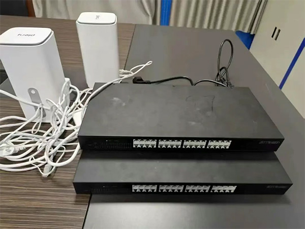 3.犯罪分子通常是将弱电间的电话设备做同线操作,如果电话号码较多,可能会在一个弱电间实施几个小时,将同线接到自带的交换机上之后,再通过5G路由器进行联网,一般犯罪分子会自带三件套,插线板、交换机、5G路由器。