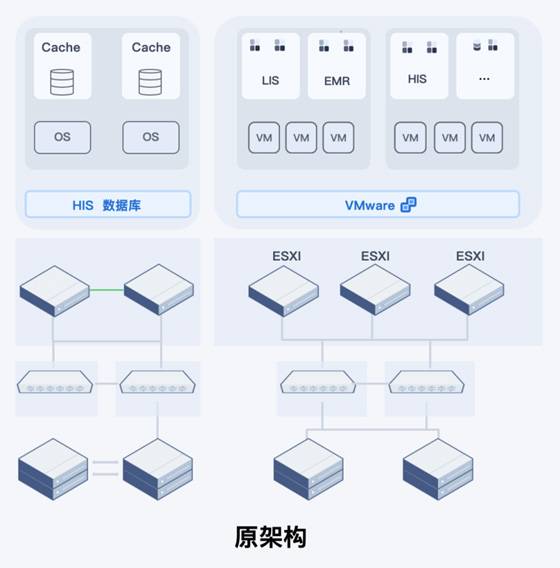 医院原采用“物理机+集中式存储”架构承载HIS数据库,以及“VMware虚拟化+集中式存储”架构承载其他业务系统,其中为保障业务连续性,集中式存储均进行了双活建设。