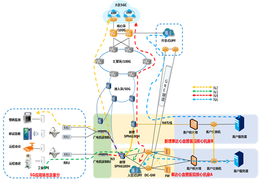 泰心医院建设5G医疗专网,包括3个室分基站,5个宏基站以及边缘计算设备,有切片专网、一体化专网、运营支撑系统三大部分。为院外的终端或者医护人员提供动态链接服务,提供实时的、动态的、SLA保障的连接能力,服务于远程急救车、移动会诊等广域移动的医疗业务。