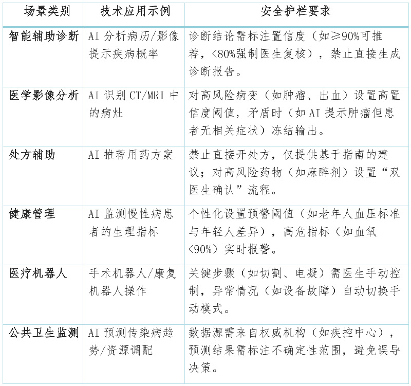 关键决策强制审核, 医疗机构在使用AI大模型的同时,要明确界定触发强制人工审核的场景,例如:涉及高死亡/致残风险的诊断或治疗建议(如癌症确诊、重大手术建议),开出高风险药物(如化疗、强效免疫抑制剂)等。
