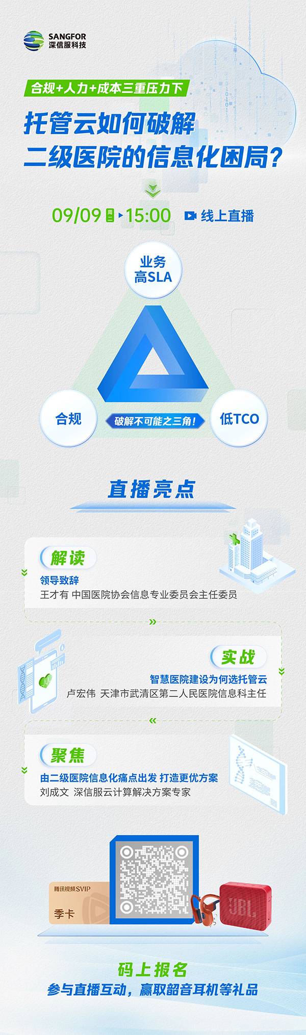 诚邀您参加深信服举办的【托管云如何破解二级医院信息化困局】直播活动,听天津市武清区第二人民医院的智慧医院建设实践,了解深信服托管云针对二级医院信息化痛点打造的最新方案!