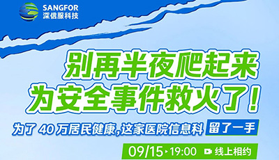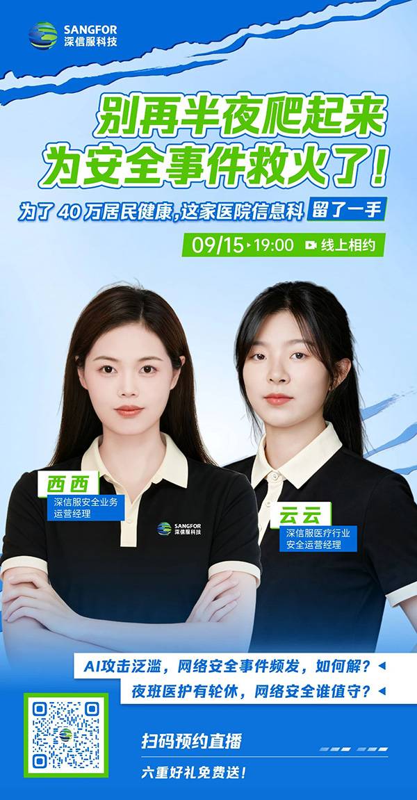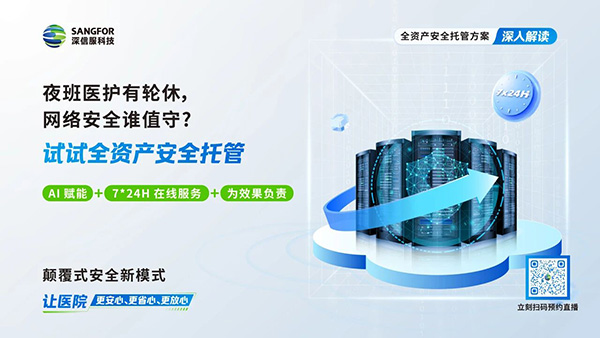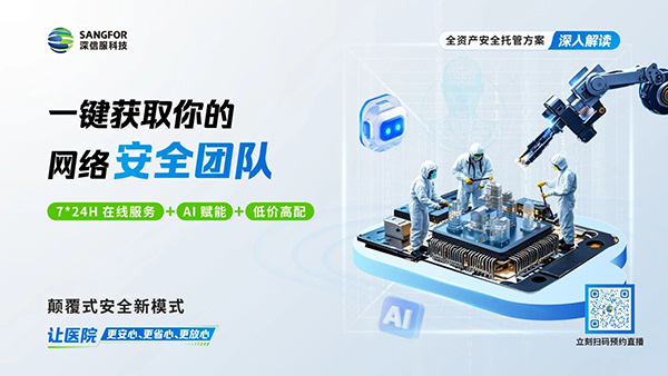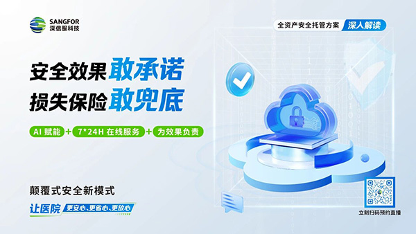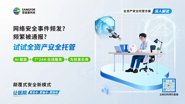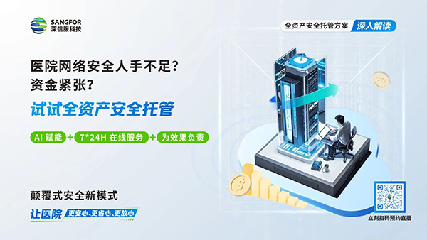 真案例,真直播!9月15日(下周一)19:00,深信服安全托管系列直播-第二期与大家不见不散!本次直播面向广大医疗用户,从当前 “医疗行业的真实安全困境” 入手,通过安全专家分享 “肩负40万群众健康重任” 的县级医院,如何有效破解网络安全困局,以及对《医院网络安全托管服务(MSS)实施指南》重点内容的介绍,帮助医疗用户深入理解安全托管到底能解决哪些难题。