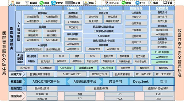 (2)应用支撑:包括智慧服务管理平台、AI用户运营平台、预约诊疗平台、处方流转平台、统一消息平台、统一支付平台等信息系统。基于自然语言驱动的医院智慧服务的能力保障,通过知识库能力、基础能力、OCR能力三大能力建设,提供平台文本切片、关键词检索、语义检索、结果排序、数据归类、检索增强(RAG)、意图识别、向量模型、排序模型、图像识别、图像处理能力等功能。