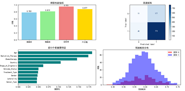 本研究采用随机森林算法构建眼癌患者生存预测模型,主要参数设置为:n_estimators=100,max_depth=8,class_weight='balanced'。数据集按0.2的比例划分为训练集与测试集。