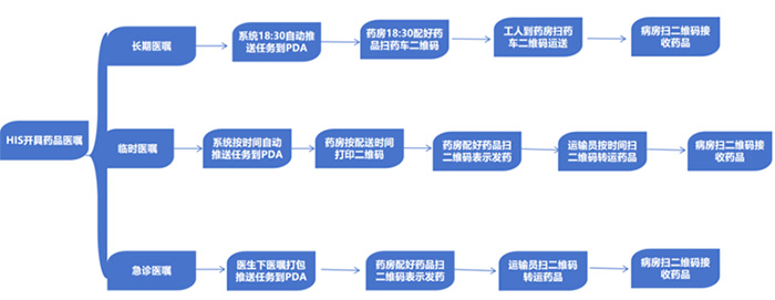 【急诊取药】医生开具药品医嘱→按开医嘱时间推送任务→药房发药→转运系统派单→运输员扫码运输药品→病区扫码接收药品。