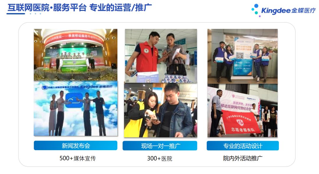 金蝶医疗在服务平台上线与应用期,多维方式吸引用户关注、使用,线下推广结合多场景触达,培养用户习惯,让患者随时随地使用行云流水的互联网医疗服务。