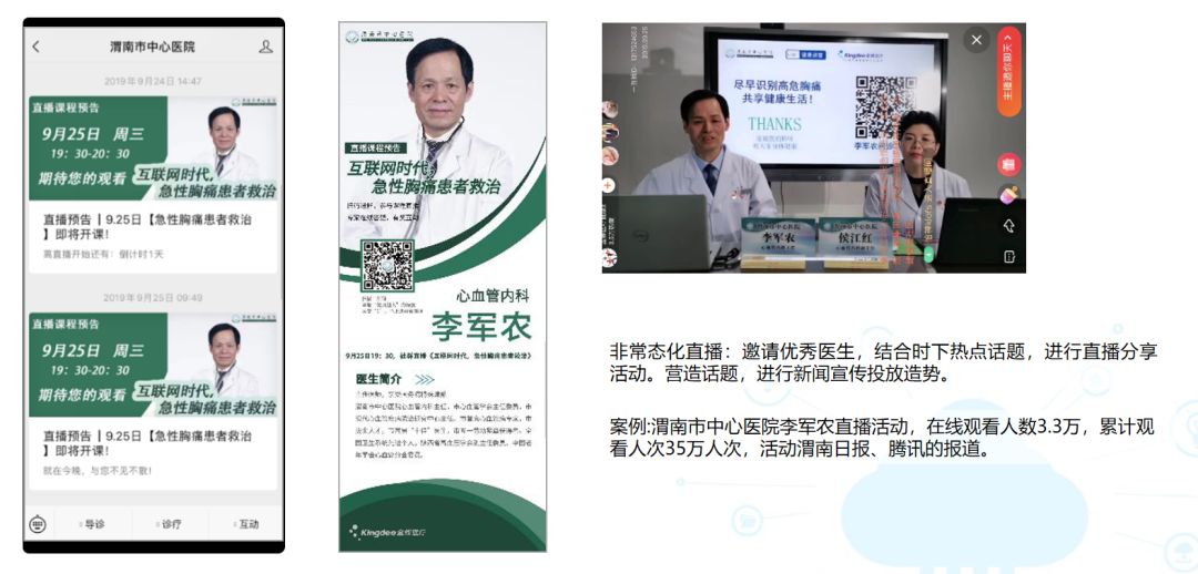 西安市红会医院是西部骨科航母,服务平台使用一直处于较低水平,金蝶医疗运营推广团队入场后,优化院内流程,建立医院自运营体系,1个月时间数据大幅增涨700%,运营效率显著提升。西安高新医院上线金蝶医疗互联网诊疗平台,金蝶医疗与院方建立联合运营中心。在用户增长方面,组织全员、科室培训,志愿者引导就诊患者,包括慢病患者使用。在活动运营方面,结合时下热点医疗常识,定期开展直播活动。内容上,与医院宣传科强强联手打造一篇篇精品宣传软文,为医生、护士定制个性化海报,直达用户。目前,互联网诊疗平台已进驻医生1000+,线上问诊2万+订单,药品配送近3000单。