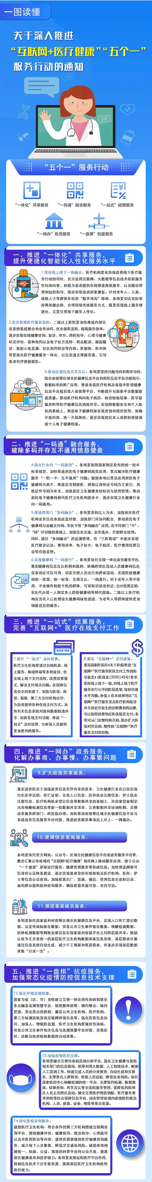 《国务院办公厅关于促进“互联网+医疗健康”发展的意见》(国办发〔2018〕26号)等文件印发以来,各地迅速行动、创新落实,推动“互联网+医疗健康”发展取得了明显成效,形成了部门协同、上下联动的良好态势。特别是在疫情防控期间,各地创新线上服务模式,为支撑疫情精准防控、避免聚集交叉感染、促进人员有序流动和复工复产等发挥了重要作用。为总结推广实践中涌现出的典型做法,进一步聚焦人民群众看病就医的“急难愁盼”问题,持续推动“互联网+医疗健康”便民惠民服务向纵深发展,国家卫生健康委、国家医保局、国家中医药局决定在全行业深化“五个一”服务行动。现将有关事项通知如下: