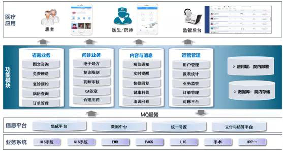 基于已经投入使用的集成平台及数据中心进行构建。该集成平台基于ESB服务总线及MQ消息机制、采用SOA架构体系,并在平台之上构建了全量实时数据中心,采用Hadoop、Hive、Spark Streaming等大数据技术,对数据进行集中存储、统一管理和高效计算。线上医疗服务平台以此为基础实现线上线下数据融合利用,为互联网海量用户提供了多并发、高性能、快速响应的数据计算及传输能力。